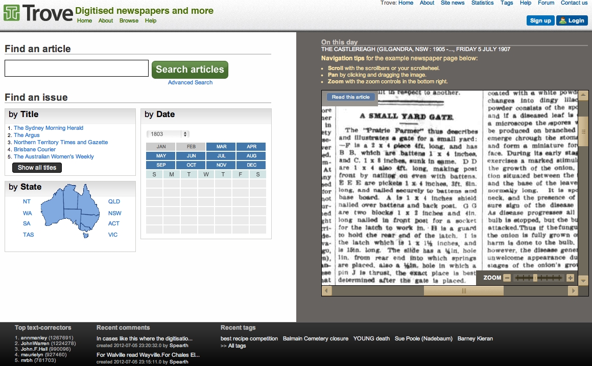 Trove is last crowdsourcing project I'll mention, but definitely not the least, the project by the National Library of Australia to digitalise old newspapers, using people to correct errors in digital scanning. I've discussed Trove before and it continues to go from strength to strength, judging from the Hall of Fame of content correctors.Tens of millions of lines in newspapers have been corrected, improving the accuracy of Australia's historic record (the Trove site even lists my blog in its archive.